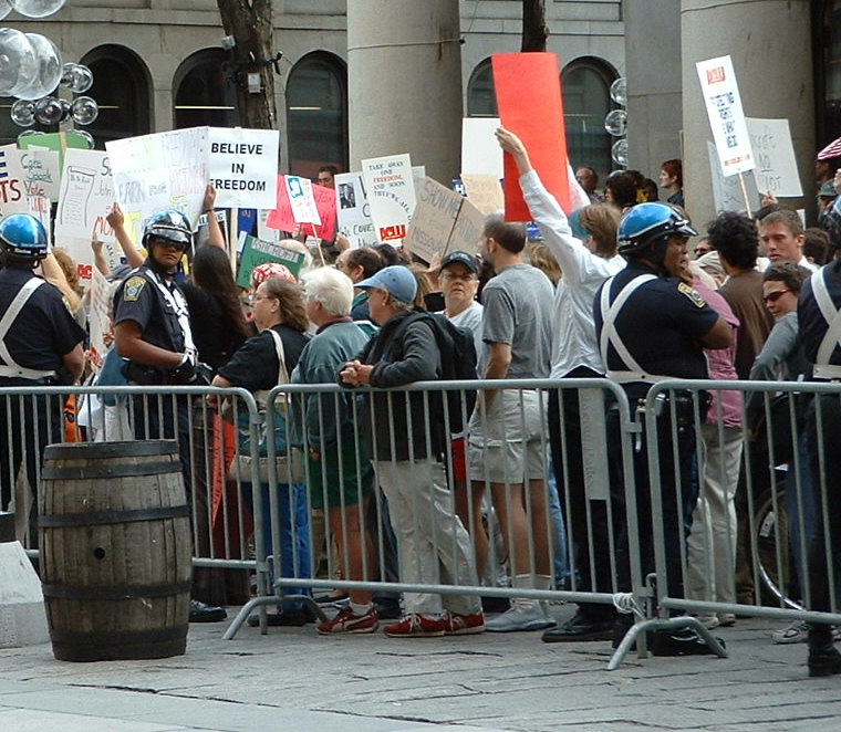 | September 28, 2003 According to John Rossant in Business Week of October 6, 2003, "the book with the most buzz [in France] is La France qui Tombe (Falling France), by historian Nicolas Baverez. It's a merciless account of how shabby the French model has become: economic growth at zero, unemployment running near 10%, and public debt approaching $1.14 trilion, all stemming from a persistent inability to modernize." -- 82% of U.S. households made a Wal-Mart purchase last year, says Business Week of October 6, 2003. I am in the 18% of U.S. households that did not. September 19, 2003 "It is evident the problem of sexual abuse by priests and bishops, and its toleration at the highest levels, have brought into public view issues that have been simmering below the surface for many years," said the Rev. William P. Leahy, president of Boston College, as quoted by Michael Paulson in an article in the Boston Globe. "The Rev. J. Bryan Hehir, head of Catholic Charities USA and a former acting dean of Harvard Divinity School, said it will take a long time for the church to overcome the effects of the abuse scandal," wrote Eric Convey in the Boston Herald. "Part of the solution, Hehir said, is for church leaders 'to treat adults as adults.'" I don't think that that is going to happen. Church leaders want adults of the "Oh, whatever you say, Father," ilk. September 14, 2003 "'Within six months of passing the Patriot Act, the Justice Department was conducting seminars on how to stretch the new wiretapping provisions to extend them beyond terror cases,' said Dan Dodson, a spokesman for the National Association of Criminal Defense Attorneys. 'They say they want the Patriot Act to fight terrorism, then, within six months, they are teaching their people how to use it on ordinary citizens.'"--from an Associated Press article at yahoo.com. September 9, 2003 As United States Attorney General John Ashcroft addressed law enforcement personnel inside Faneuil Hall in Boston about the Patriot Act, a crowd, which I would unscientifically estimate to number about three hundred, stood outside in protest. Among those briefly addressing the throng were United States Representative Michael Capuano of Massachusetts' Eighth Congressional District. "Boston City Police estimate there were 1,200 protesters on hand outside Faneuil Hall during Ashcroft's speech," says an Associated Press article at boston.com. The police may be right, but the crowd did not appear so large to me. |